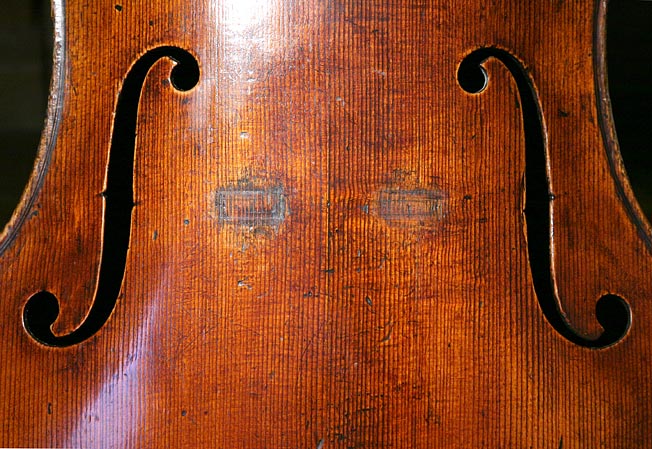 Typische F-Löcher eines Montagnana-Cellos: Die Klappen sind stark abgerundet, der Abstand zwischen den oberen Kugeln ist bedeutend größer als beispielsweise bei Stradivari oder dem oben abgebildeten Guarneri-Cello.