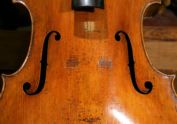 Hier die F-Löcher aus der Nähe, sie sind schräg gestellt, kurz, aber reativ weit geöffnet. Typisch ist der schöne Schwung besonders an den unteren Klappen, auch die tiefen Einschnitte findet man ebenso bei Jacob Stainer.